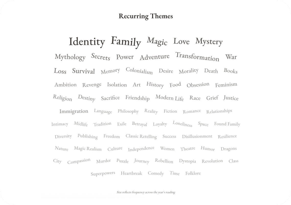 Two other big accelerators this year were—surprisingly—the Kobo Clara BW I bought a few months ago, and a yearly membership to a couple of local libraries. Highly recommend both.