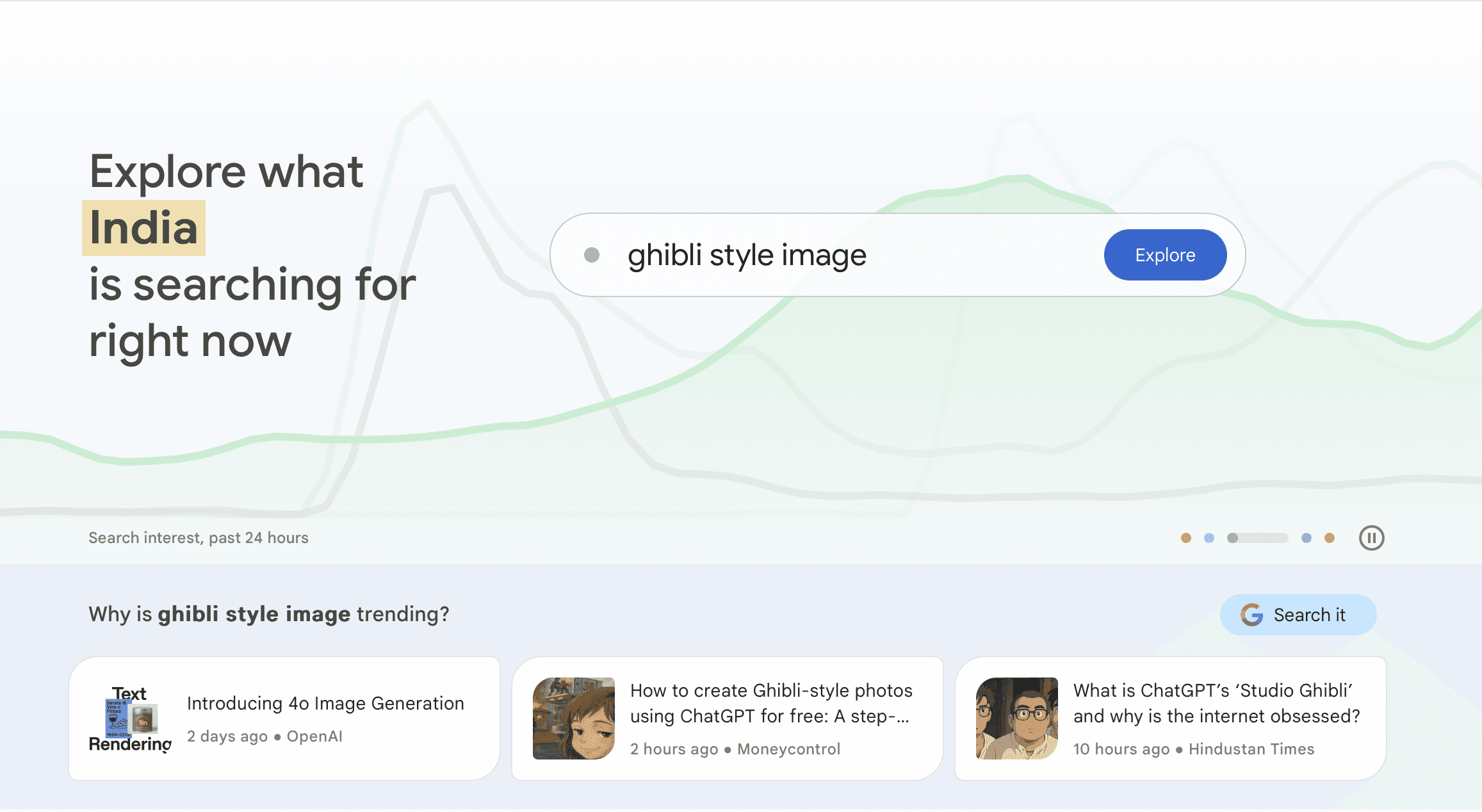 This zeitgeist is perfectly captured in this screenshot of recent Google Trends data. The trending searches are all about the quickest path to creating something superficially similar to Ghibli's work, without any interest in understanding what makes their artistic approach meaningful or distinctive. The Hindustan Times even calls it "ChatGPT's Studio Ghibli". It’s a misattribution that shows how readily we're willing to transfer ownership of artistic styles from their original creators to the AI tools that imitate them.