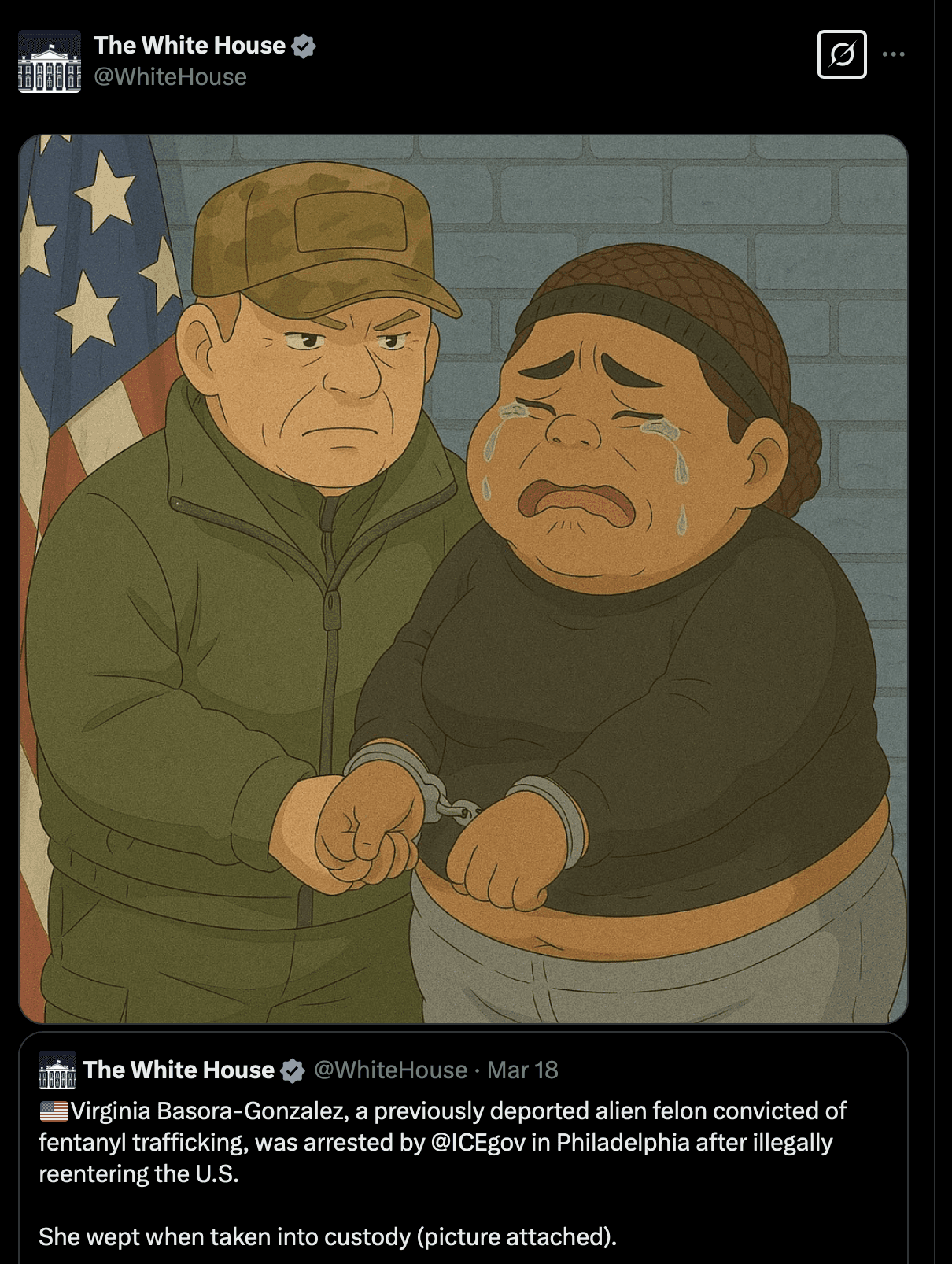 Look at this post from the White House's official X account: an actual photo of a detained immigrant converted into 'Studio Ghibli style' art. When the highest office in one of the world's most powerful nations reduces law enforcement and human suffering to cutesy memes, we've moved beyond bad taste into something genuinely dystopian. This goes beyond cultural flattening and misappropriation, it's institutional trivialisation (and of course the style isn't accurate).